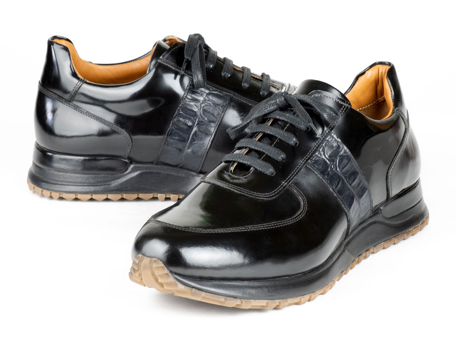 - Black polished leather upper.