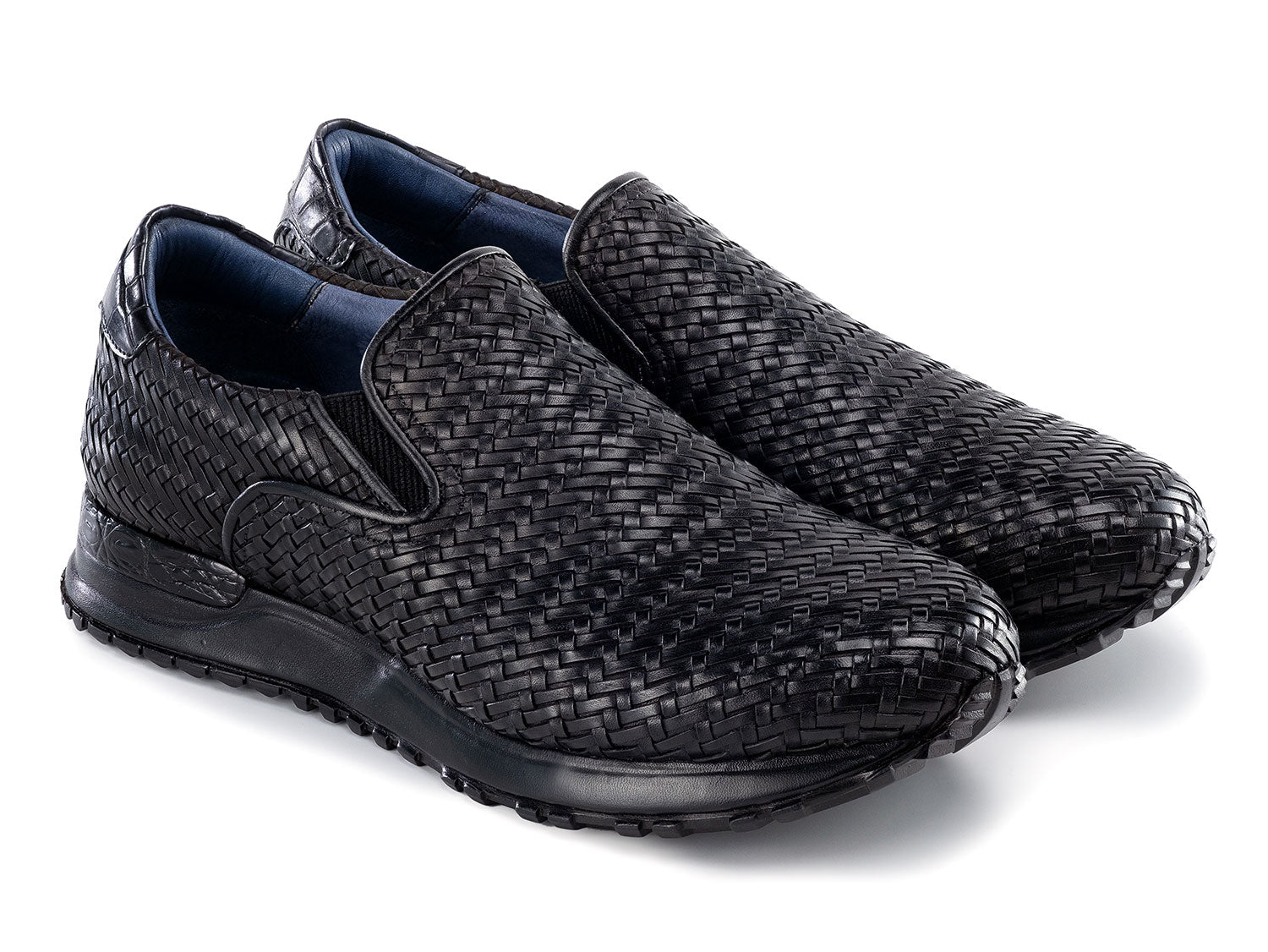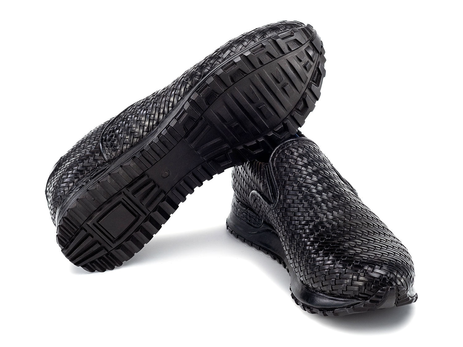 - Black hand-painted woven leather upper.